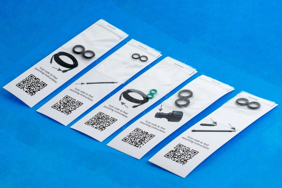 Twee complete kits voor het vervangen van versleten O-ringen op standaard accessoires van Husqvarna hogedrukreinigers.